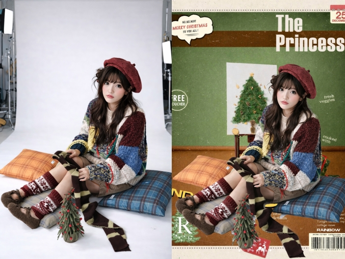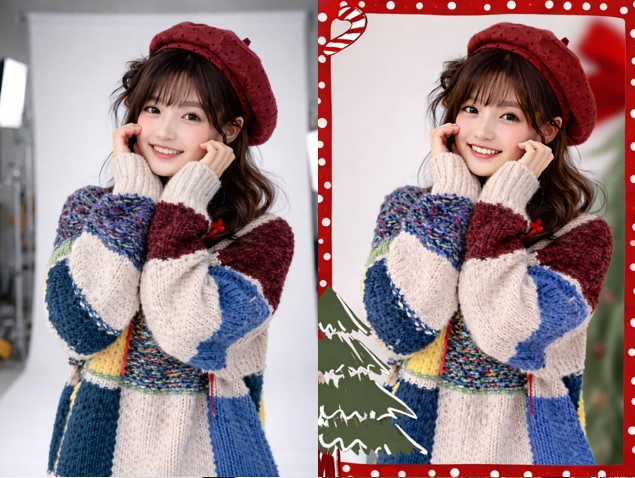 基础人像搞定,圣诞氛围怎么能少?一键抠图换背景功能直接封神!圣诞树🎄、麋鹿🦌、飘雪❄️、音乐盒🎵、复古壁炉…… 你能想到的圣诞元素,想要哪个用哪个,再也不用辛辛苦苦搭场景、扫背景。AI智能抠图精准又自然,人物与背景无缝融合,节日感一下就拉满,发朋友圈绝对秒获满屏点赞!